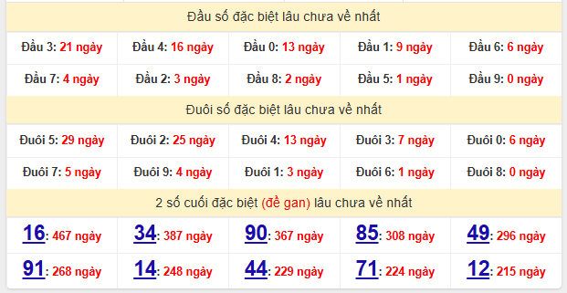 Thống kê 2 số cuối giải đặc biệt (đề gan) lâu chưa về: 16: 467 ngày; 34: 387 ngày; 90: 367 ngày; 85: 308 ngày; 49: 296 ngày; 91: 268 ngày; 14: 248 ngày; 44: 229 ngày; 71: 224 ngày; 12: 215 ngày.