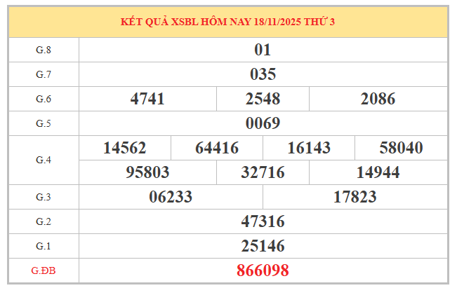 Tổng quan kết quả cho thấy đầu 4 và đuôi 6 xuất hiện với mật độ cao, tạo ra điểm mạnh của kỳ quay trước. Giải nhất, giải ba đều mang những con số quen thuộc, trong khi giải tám nổi bật với số 01 – vốn là con số xuất hiện khá ít trong các kỳ trước. Đây là yếu tố quan trọng để người chơi tiến hành dự đoán XSBL ngày 25/11/2025 tỷ lệ trúng thưởng cao.
